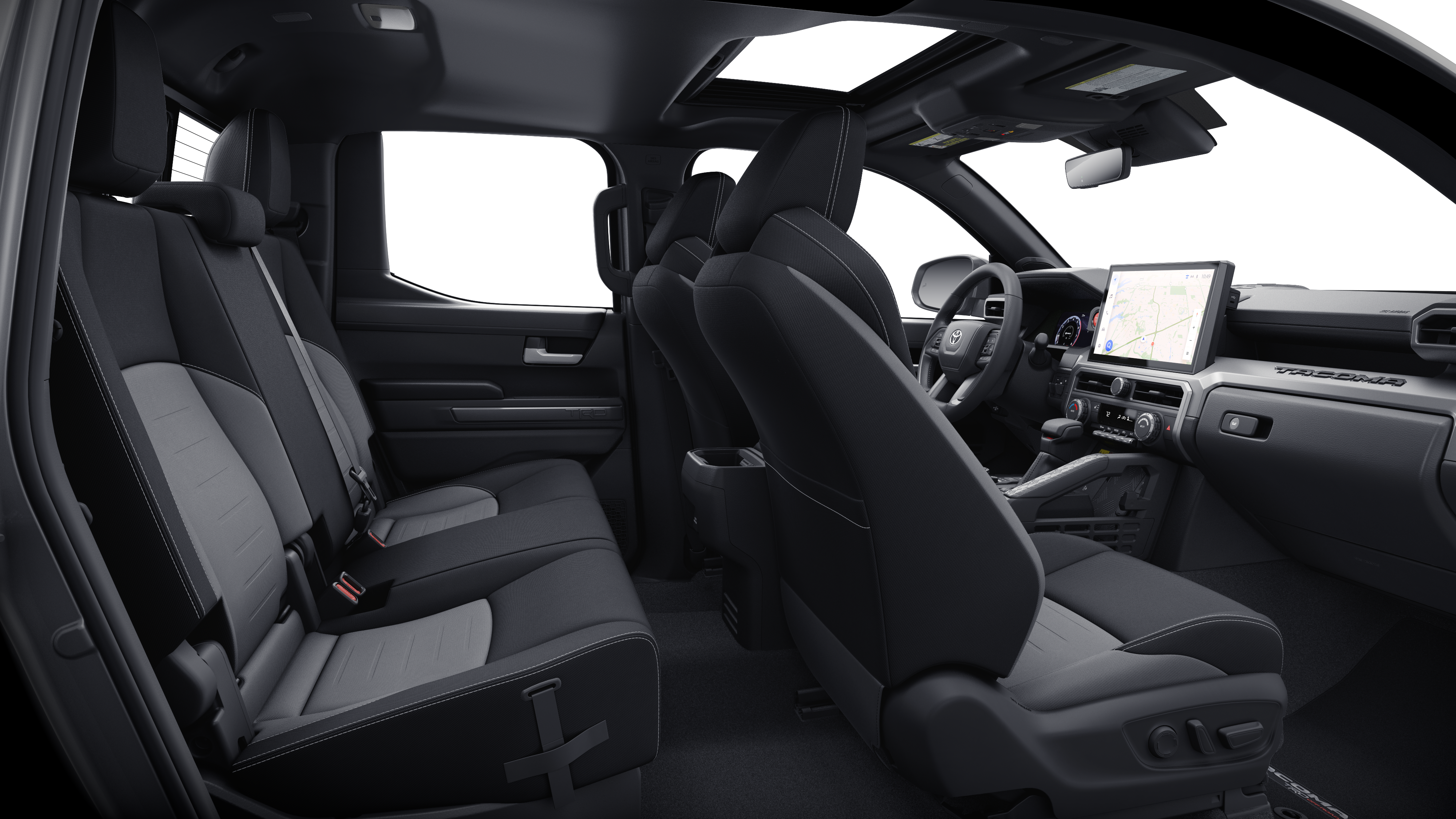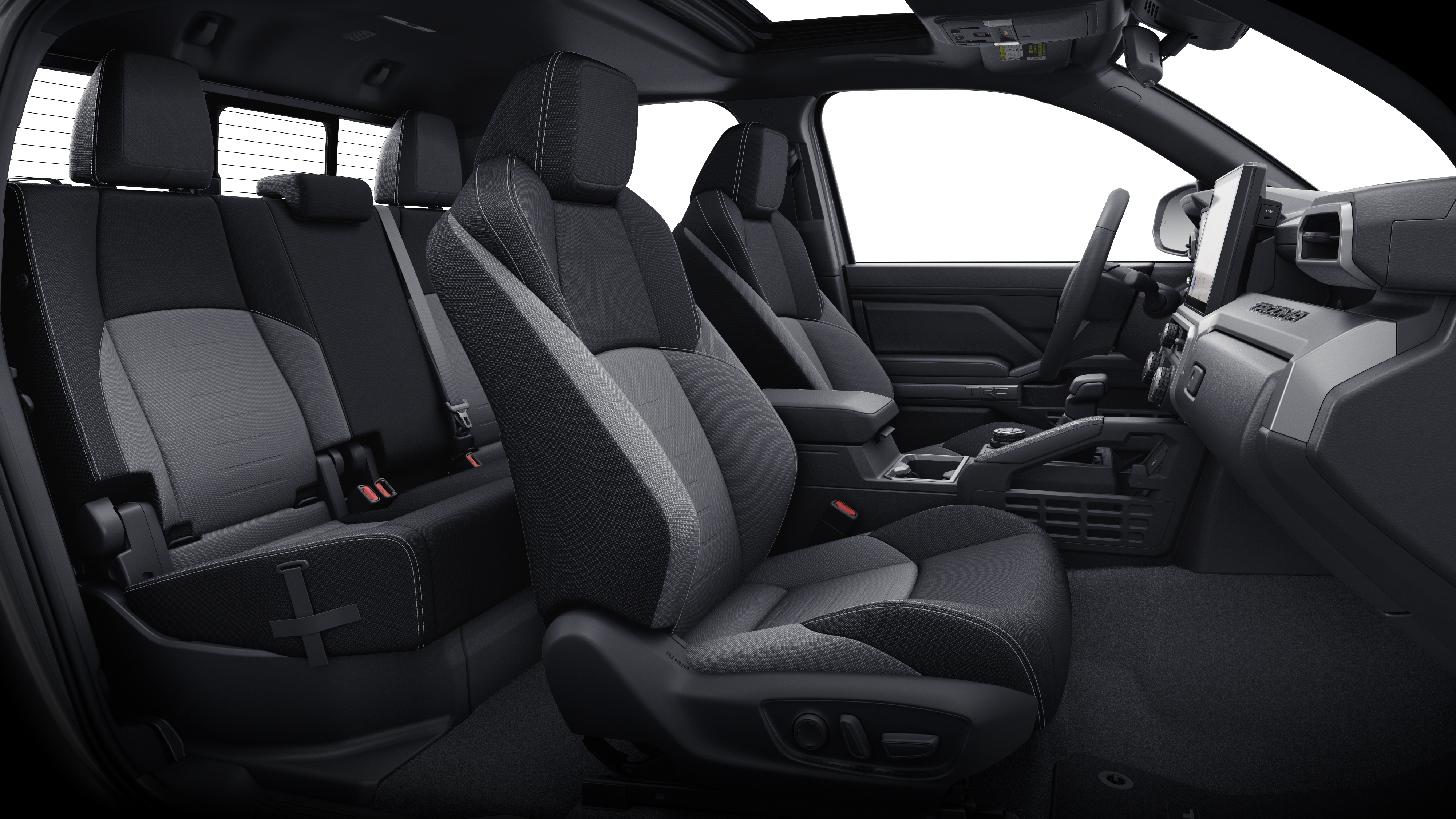 Equipped with TRD Off Road Upgrade Package (JBL Premium Audio and Power Horizontal Rear Window), 4WD, 3.583 Axle Ratio, 4-Wheel Disc Brakes, 6 Speakers, ABS brakes, Air Conditioning, Alloy wheels, AM/FM radio: SiriusXM, Anti-whiplash front head restraints, Apple CarPlay/Android Auto, Auto High-beam Headlights, Auto-dimming Rear-View mirror, Automatic temperature control, Brake assist, Bumpers: body-color, Driver door bin, Driver vanity mirror, Dual front impact airbags, Dual front side impact airbags, Electronic Stability Control, Emergency communication system: Safety Connect (1-year trial), Exterior Parking Camera Rear, Fabric Seat Trim, Four wheel independent suspension, Front anti-roll bar, Front Bucket Seats, Front Center Armrest, Front fog lights, Front reading lights, Fully automatic headlights, Heated door mirrors, Illuminated entry, Knee airbag, Leather Shift Knob, Leather steering wheel, Low tire pressure warning, Moon Roof, Occupant sensing airbag, Outside temperature display, Overhead airbag, Overhead console, Panic alarm, Passenger door bin, Passenger vanity mirror, Power door mirrors, Power steering, Power windows, Radio: 8" Toyota Audio Multimedia, Radio: Premium Audio w/14" Display (EF), Rear step bumper, Rear window defroster, Remote keyless entry, Security system, SofTex Seat Trim, Speed control, Speed-sensing steering, Split folding rear seat, Spray-On Bed Liner (TMS), Steering wheel mounted audio controls, Tachometer, Telescoping steering wheel, Tilt steering wheel, Traction control, Trip computer, Turn signal indicator mirrors, Variably intermittent wipers, and Wheels: 17" TRD Off-Road Alloy.