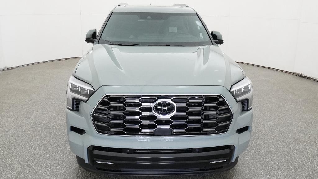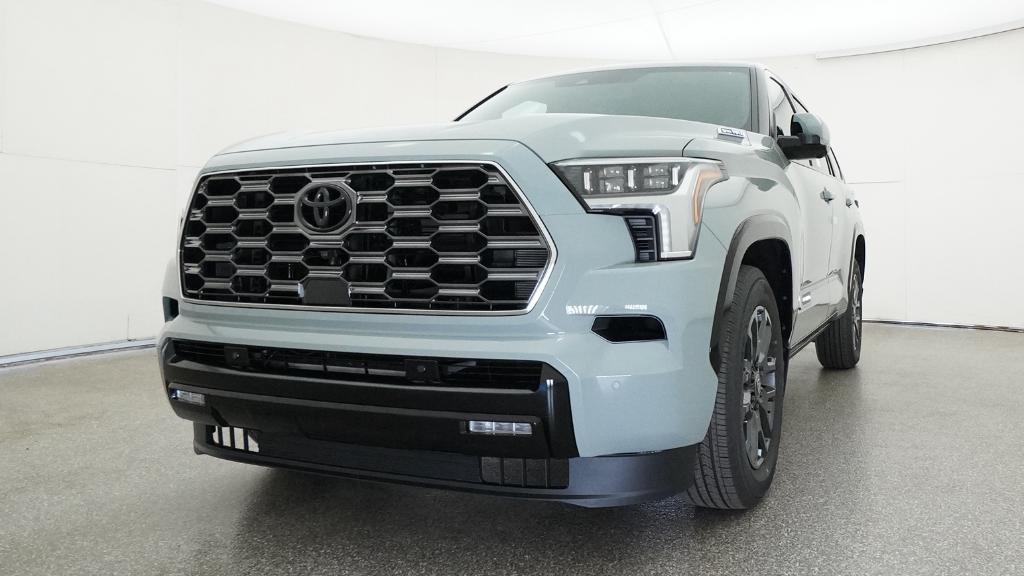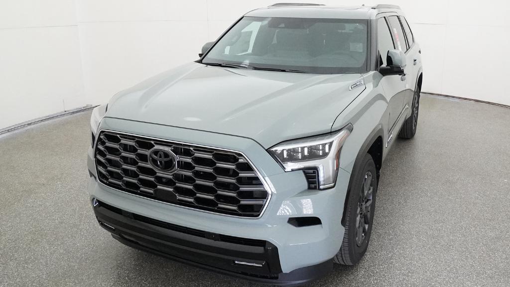 Equipped with V6 Hybrid, 10-Speed Automatic, 4WD, 14 Speakers, 3rd row seats: split-bench, 4-Wheel Disc Brakes, ABS brakes, Air Conditioning, Alloy wheels, AM/FM radio: SiriusXM, Anti-whiplash front head restraints, Apple CarPlay/Android Auto, Auto High-beam Headlights, Auto tilt-away steering wheel, Auto-dimming door mirrors, Auto-dimming Rear-View mirror, Automatic temperature control, Brake assist, Bumpers: body-color, Compass, Delay-off headlights, Driver door bin, Driver vanity mirror, Dual front impact airbags, Dual front side impact airbags, Electronic Stability Control, Emergency communication system: Safety Connect (10-year trial), Exterior Parking Camera Rear, Front anti-roll bar, Front Bucket Seats, Front Center Armrest w/Storage, Front dual zone A/C, Front fog lights, Front reading lights, Front wheel independent suspension, Fully automatic headlights, Garage door transmitter: HomeLink, Head Up Display (HUD), Headlight cleaning, Heated and Ventilated Front Seats, Heated door mirrors, Heated front seats, Heated rear seats, Heated steering wheel, Illuminated entry, Knee airbag, Leather steering wheel, Low tire pressure warning, Memory seat, Navigation system: Drive Connect (1 year trial) includes Cloud Navigation with real time traffic and Google POI, Occupant sensing airbag, Outside temperature display, Overhead airbag, Overhead console, Panic alarm, Passenger door bin, Passenger vanity mirror, Power door mirrors, Power driver seat, Power Liftgate, Power moonroof, Power passenger seat, Power Running Boards, Power steering, Power windows, Premium audio system: JBL, Premium Leather Seat Trim, Radio: 14" Toyota Audio Multimedia with JBL Premium Audio, Rain sensing wipers, Rear air conditioning, Rear reading lights, Rear seat center armrest, Rear window defroster, Rear window wiper, Reclining 3rd row seat, Remote keyless entry, Security system, Speed control, Speed-sensing steering, Split folding rear seat, Spoiler, Steering wheel mounted audio controls, Tachometer, Telescoping steering wheel, Tilt steering wheel, Traction control, Trip computer, Turn signal indicator mirrors, Variably intermittent wipers, Ventilated front seats, Ventilated rear seats, Voltmeter, and Wheels: 20" Machined-Finish Black Alloy.